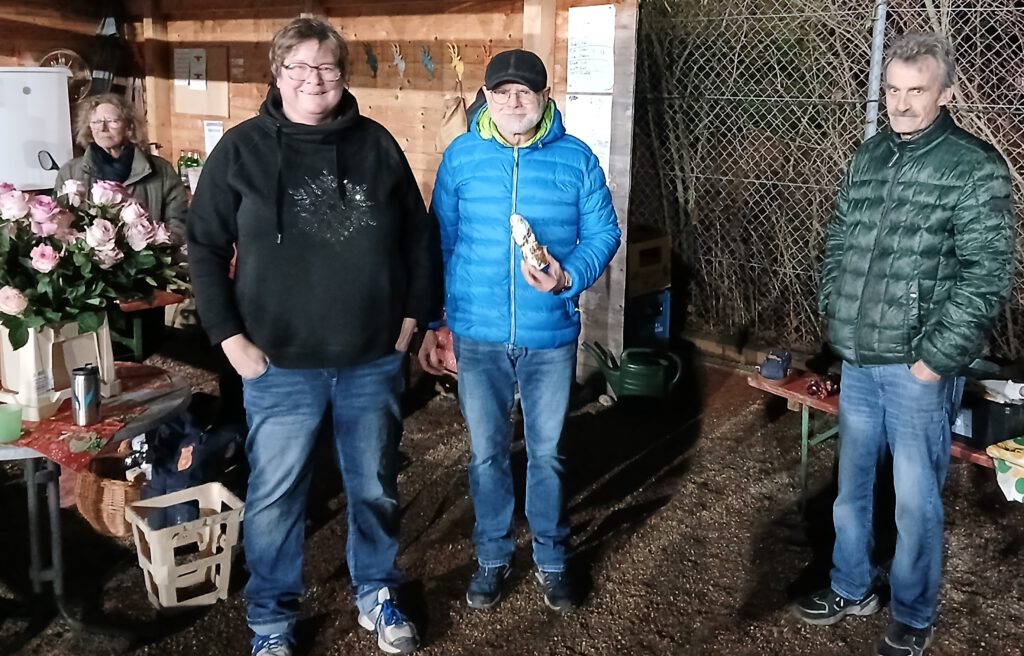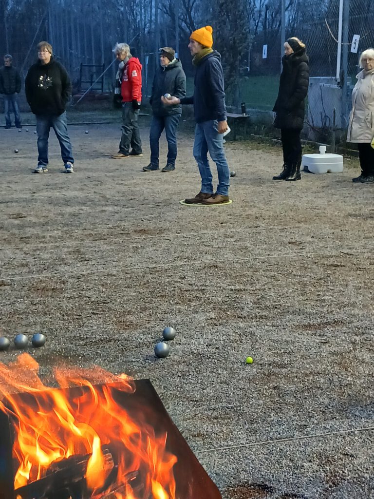 Das Wetter erinnert ja momentan eher an Vorfrühling denn an Winter. Deshalb auch die spontane Idee, zum ersten Mal ein Adventsturnier unserer Abteilung auszurichten. Und es war ein toller Erfolg. Fast 20 Spielerinnen und Spieler ließen sich die Gelegenheit nicht entgehen, zu dieser Jahreszeit ein kleines Turnier zu spielen. In 3 Runden Supermelée (die Paarungen werden immer neu ausgelost) im Doublette gab es tolle Spiele, viel Spaß und zum Schluss nur Gewinner. Den goldenen Nikolaus holte sich Arthur Acquistapace vor Stefan Bolkart. Und alle anderen belegten dann gemeinsam den dritten Platz. Glühwein, Tee und Kaffee fanden ihre Liebhaber. Plätzchen und Gepäck unterschiedlichster Art, passend zur Weihnachtszeit, versüßten den Nachmittag. Ein schöner Abschluss des Jahres Und das nächste Event ist schon im Blikfeld: Das Neujahraturnier am 1. Januar.