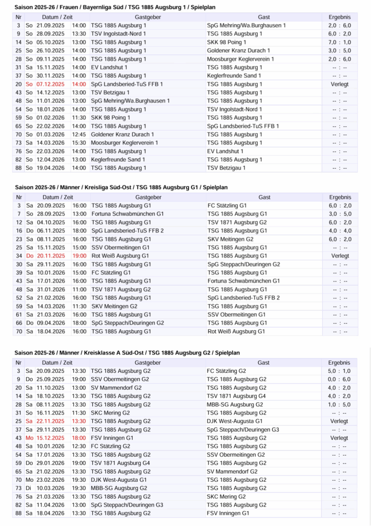 mit drei Mannschaften im Spielbetrieb der Sportkegler aktiv:Frauen: TSG 1885 Augsburg 1 (Frauen Bayernliga-Süd)